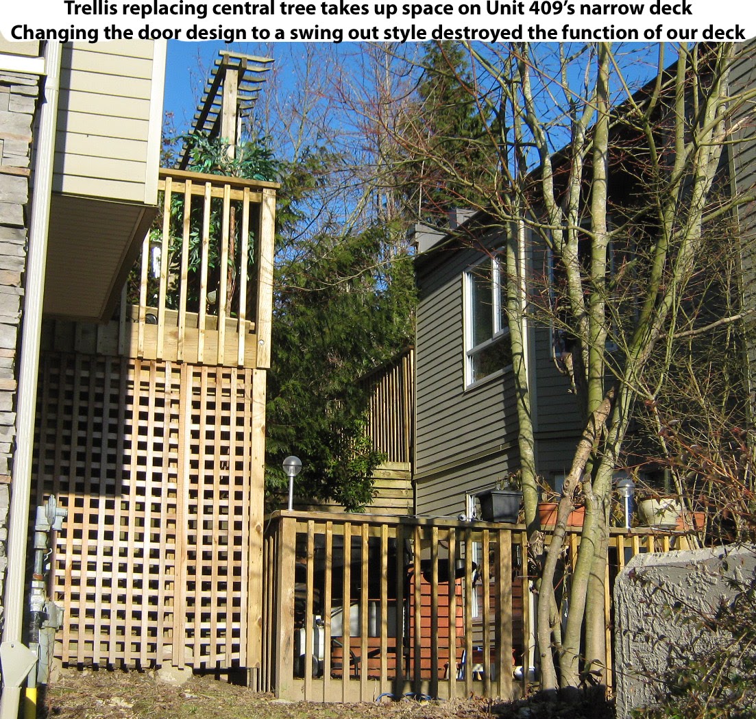 In order to build the original decking adjacent to Unit 407 the owner unlawfully cut down the center tree in a row of 3 vine maples that the Phase One developer's landscape architect planted between Buildings 6 and 7, not just for privacy, but for geotechnical security pursuant to supposedly binding restrictive covenants that run with the land. Since then trellis planters continually occupy 409's patio in place of the tree to mitigate the loss of privacy.